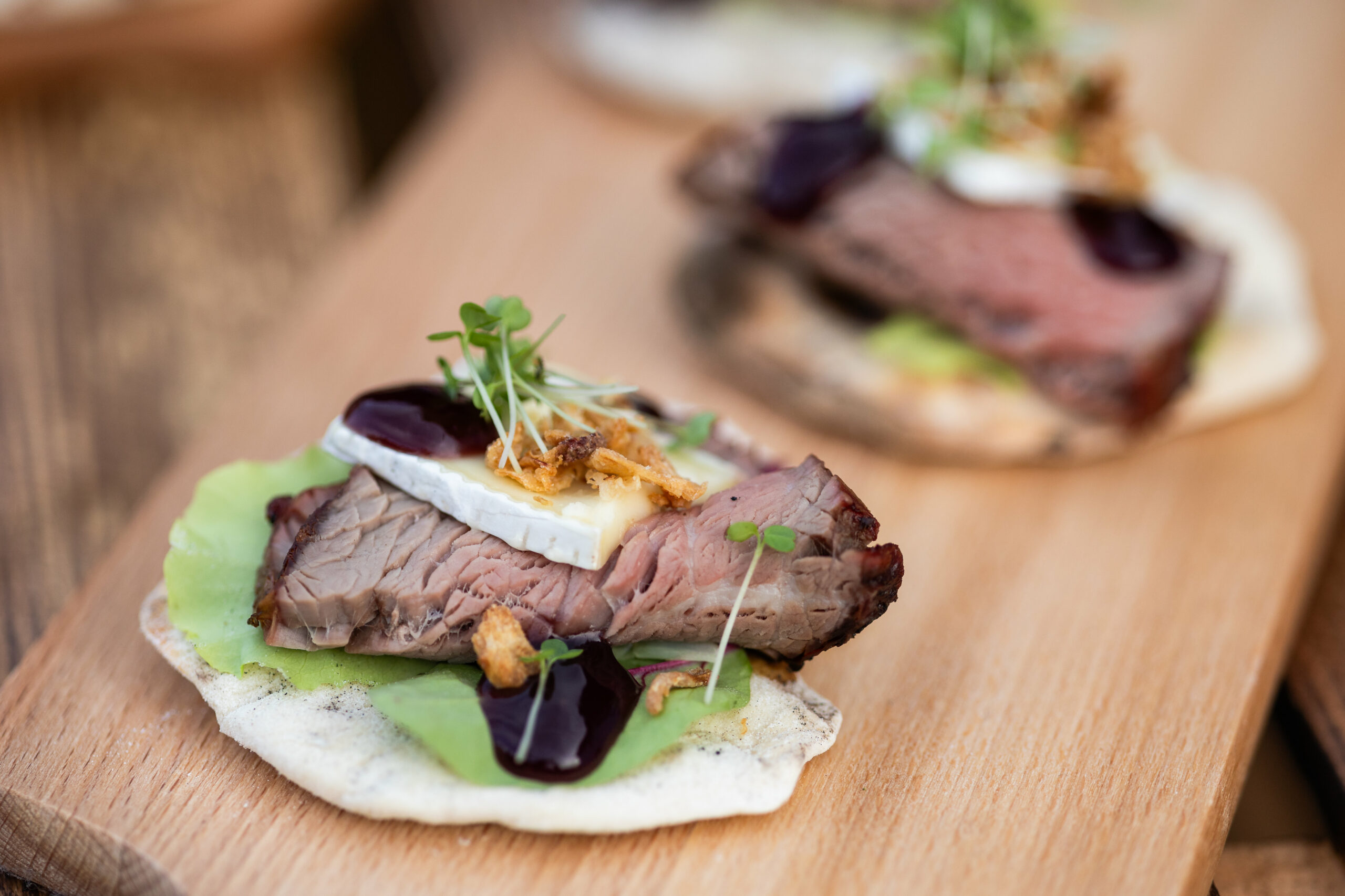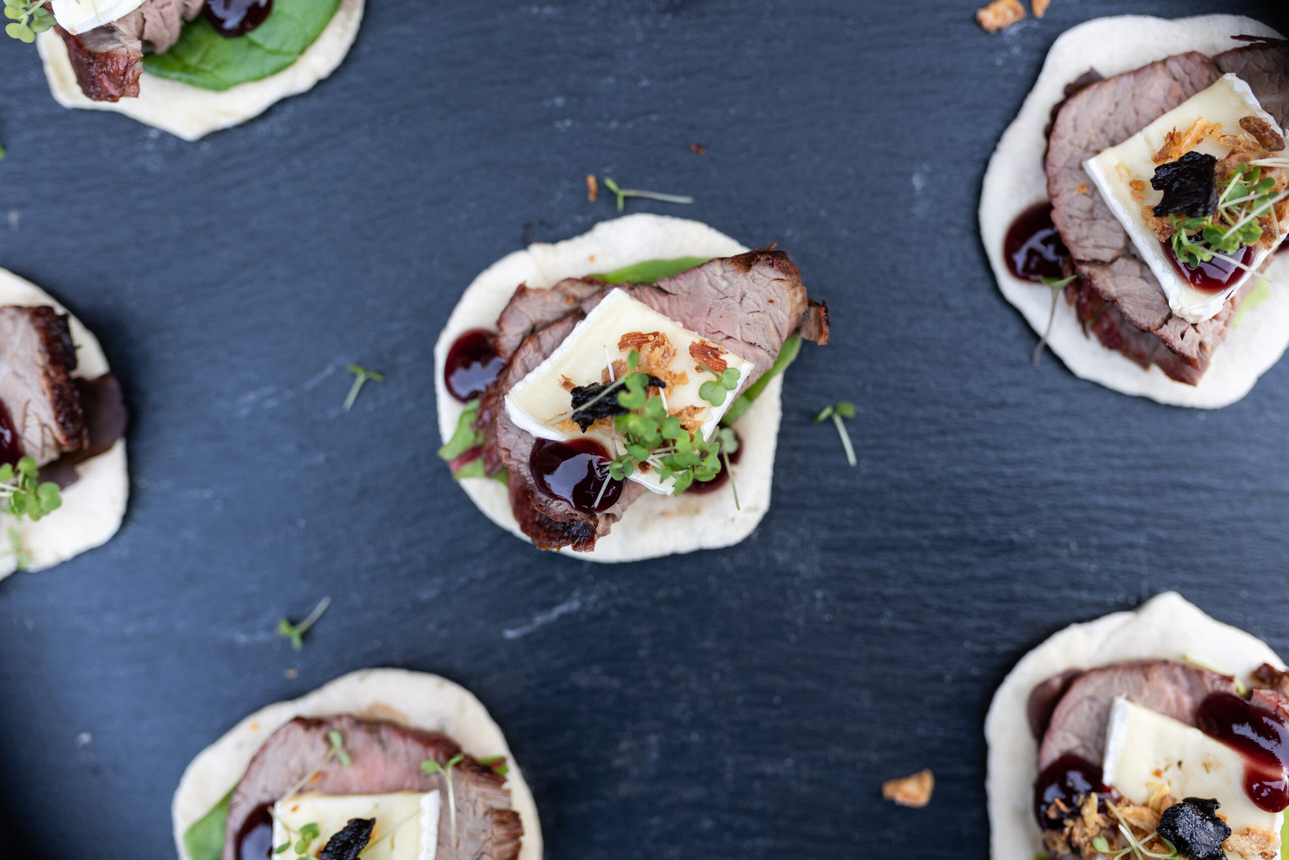 - Rosa Roastbeef auf Pfannenbrot mit Camembert und Dip